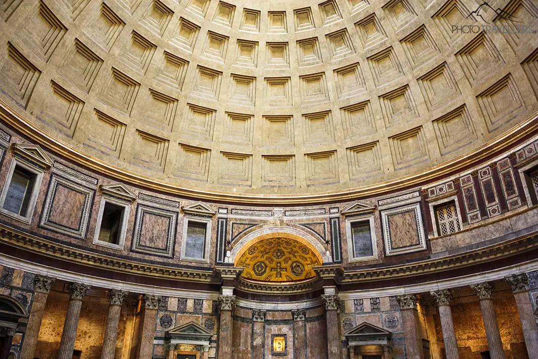 Lo spettacolare Pantheon dall'interno La cupola è aperta in alto, il che significa che quando piove, piove dentro. Quando il sole splende, tuttavia, si possono osservare emozionanti giochi di luce.