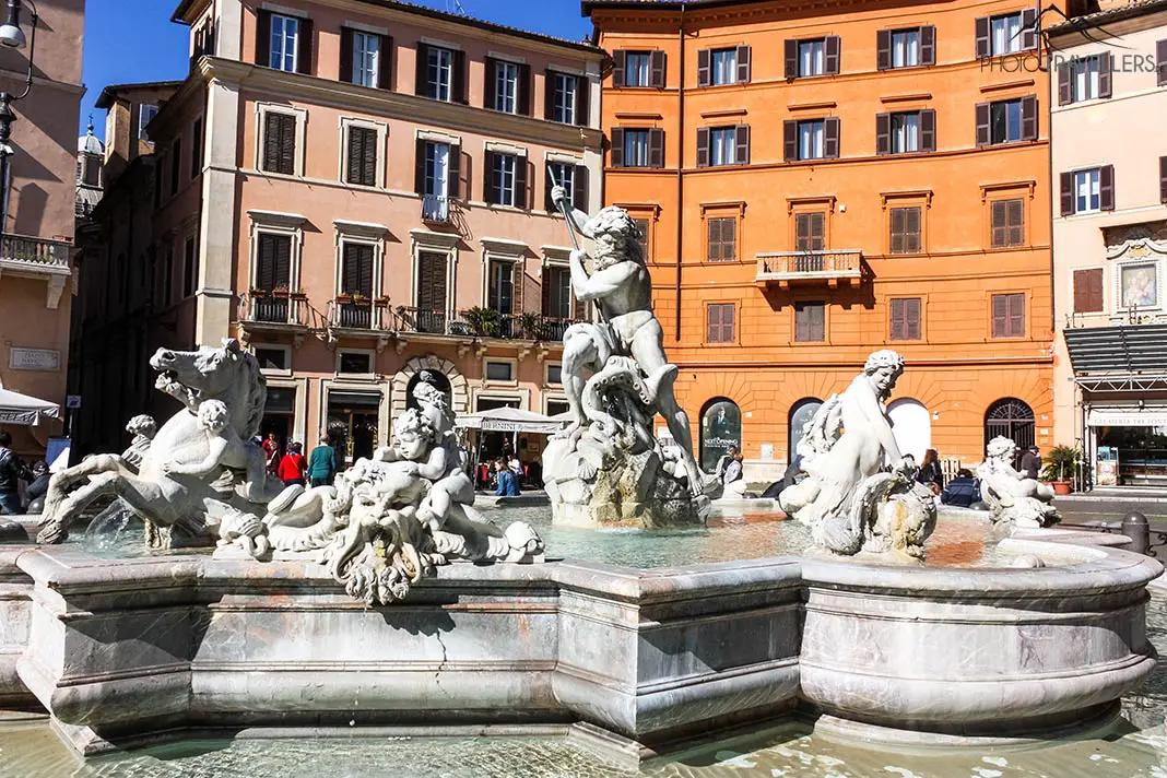 Inoltre, nella Piazza si trovano due fontane più antiche ma più piccole la Fontana del Nettuno a nord e la Fontana del Moroa sud. a sud. Altre chiese e palazzi, oltre a caffè turistici e negozi di souvenir, costeggiano la bella piazza. e negozi di souvenir costeggiano la bella piazza nel cuore di Roma.