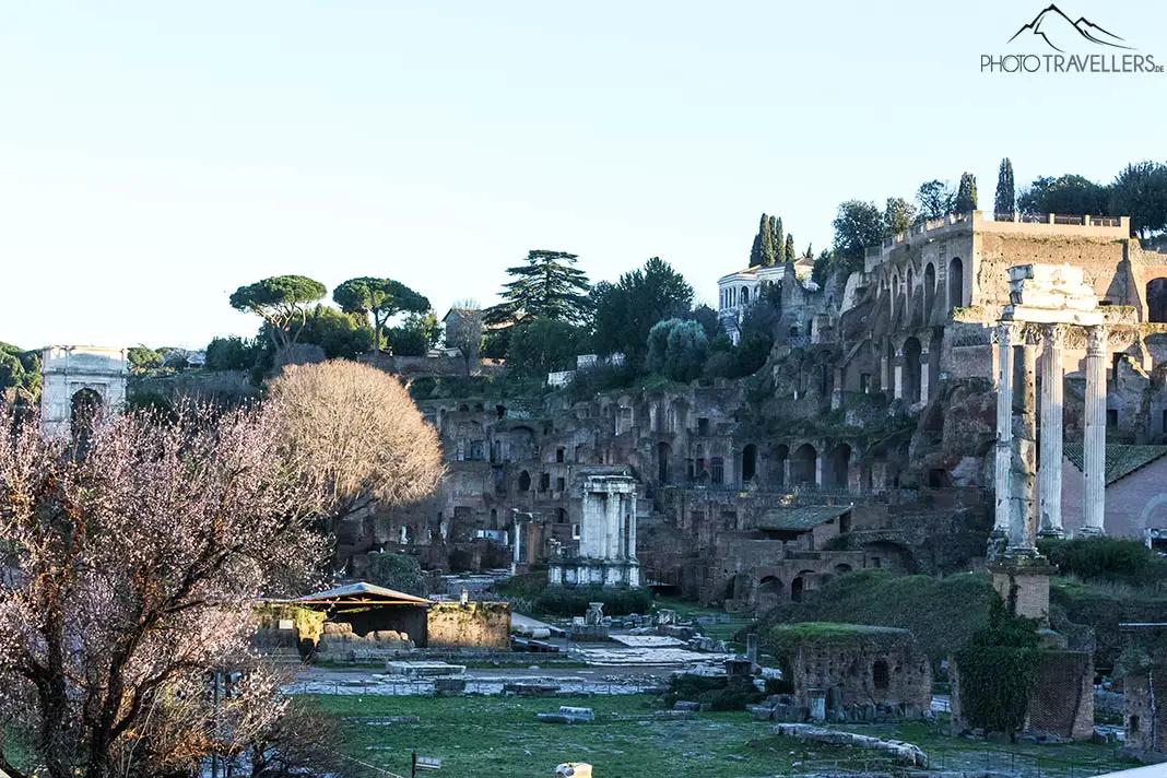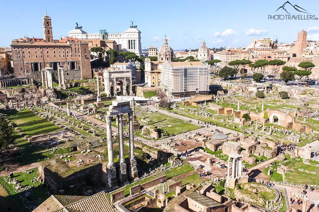Vista del Foro Romano dall'esterno - sulla destra si vede la terrazza panoramica sul Palatino. La terrazza si trova sul terreno del Foro Romano, per il quale si deve pagare un biglietto d'ingresso, ma in cambio si gode di una vista eccezionale.